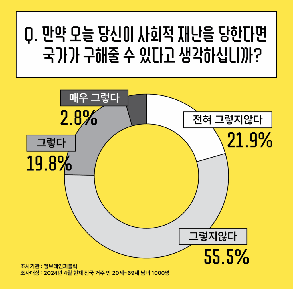 올해 4월, 여론조사 기관 엠브레인퍼블릭에서 실시한 설문조사에 따르면 국민의 73.6%가 세월호의 진상이 충분히 규명되지 않았다고 답했다. 어떤 부분에서 진상규명이 제대로 이뤄지지 않았다고 생각하는지 묻는 문항에는 응답자의 39.8%가 ‘세월호의 직접적인 침몰 원인 규명’을, 32.3%가 ‘참사 당일 박근혜 전 대통령 행적 및 보고 과정 의혹 규명’을 언급했다. 10년의 공방과 기다림의 끝에 국민들이 얻은 것은 여전한 물음표였다. 10년 전보다 세상이 안전해진 것 같냐는 질문에는 그렇지 않다는 답변이 76.7%를 차지했고, 재난 상황에서 국가가 자신을 지켜줄 수 있다고 믿는지 묻는 질문에서도 그렇지 않다는 응답 비율이 77.4%를 차지했다. 세월호 참사로부터 흘러온 세월이 무색하게, 국민들의 경각심과 불신에 발맞추지 않은 국가는 참사를 오늘날까지도 현재진행형으로 만들고 있었다.