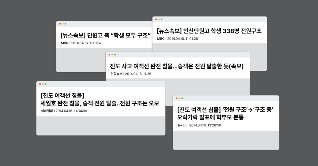 예고 없이 닥쳐온 거대한 상실은 전 국민에게 슬픔을 넘어 분노와 좌절감을 느끼게 했다. 그러나 세월호 참사를 기억하겠다고, 애도하겠다고 말하는 것조차 힘들었던 시기가 있었다. 참사가 참사로 읽히는 대신 정치로 읽히던 시간이었다. 해명 요구와 질책의 목소리가 커지는 상황에서 책임을 모면하기 위해 정부가 벌인 여론전이 문제였다.