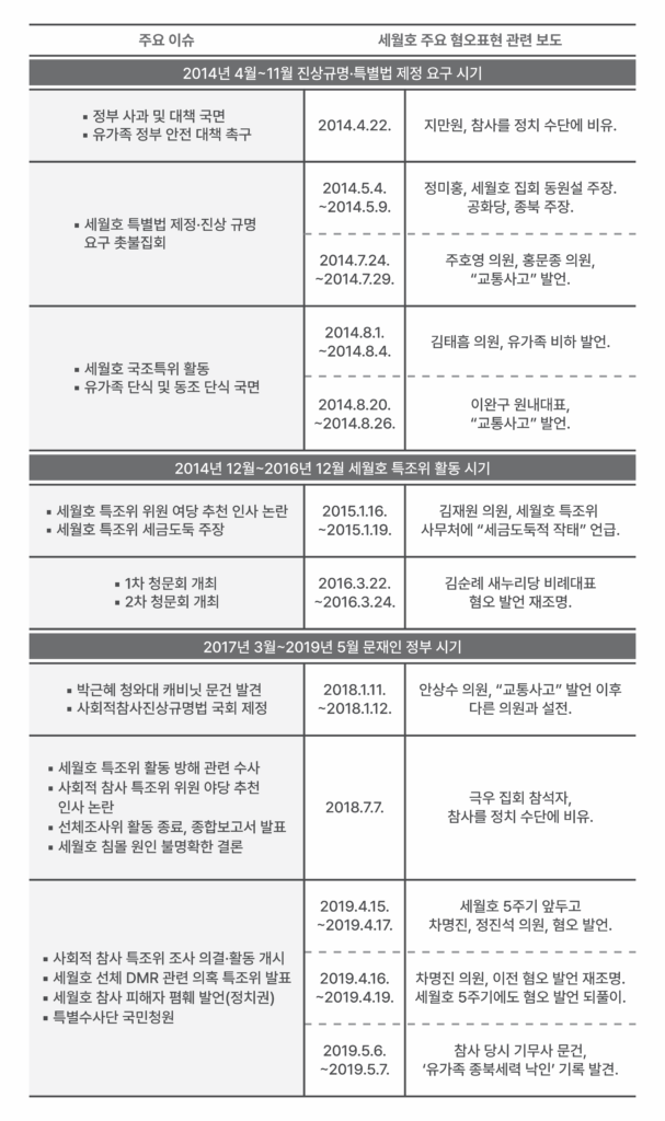 정치인들도 세월호 혐오표현을 발화하며 세월호 참사와 유가족에 대한 인식 왜곡에 적극 가세했다. 세월호 참사 이후 수많은 세월호 혐오표현이 생산되고 소비됐지만, 사참위의 「재난 피해자 명예훼손 등 실태조사 및 개선방안 연구 최종 보고서」에서 지적했듯 해당 발언의 발화 주체에 따라 그 영향력과 확산력은 달라졌다. 정치·사회적 영향력이 가장 강하고 발화에 자신감과 정당성을 부여할 수 있는 정치권, 즉 정부의 발화에서 등장한 혐오표현들은 혐오의 사회적 확산에 크게 기여했다. 특히 이들의 발화는 정치적으로 중요한 국면마다 집중적으로 등장하며 참사의 경중보다 정치적 득실과 연결되는 양상을 보였다. 박근혜 전 정부 책임론이 거세게 불거진 참사 일주일 뒤의 시점에는 참사를 정치 수단에 비유하는 표현이나 ‘종북 빨갱이’ 등의 표현이 다수 등장했고, 세월호 특별법 제정 관련 갈등이 심화되던 2014년 7~8월과 박 전 정부의 특조위 방해 관련 수사가 진행된 2018년 1월에도 정치권에서 비슷한 언행이 반복됐다. 이들 발언은 주로 미래통합당 계열의 보수 정당에서 등장했다. 그때마다 참사는 얼룩졌고, 국민들은 점차로 지쳐갔다.