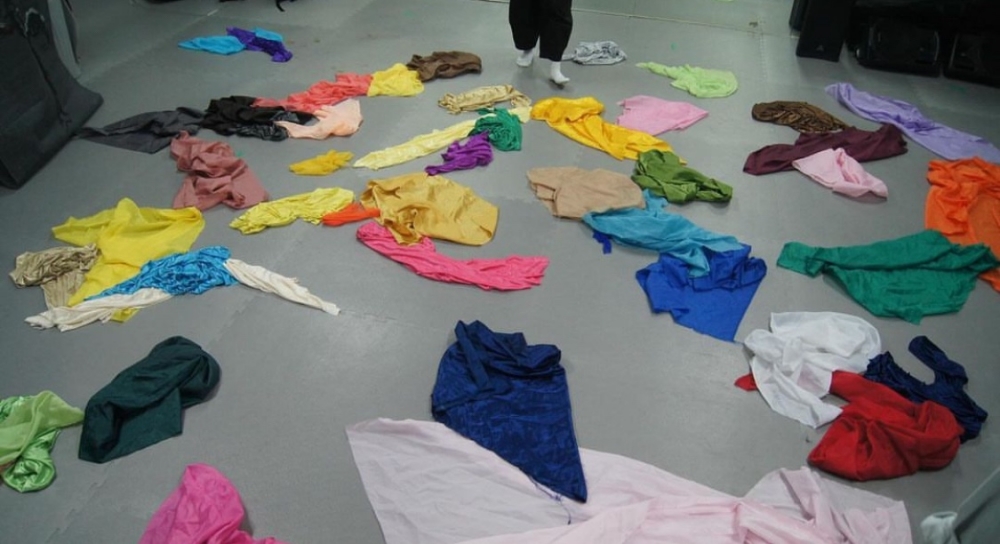 표를 확인하고 들어간 공연장은 작은 운동장 같았다. 한쪽 벽 전체에 커다란 무지갯빛 천이 드리워져 있었고, 그 옆엔 미리 받은 이야기들이 전시돼있었다. 무대에 놓인 의자 양옆으론 여러 빛깔의 천들이 걸려있었다. 객석은 여러 형태와 질감을 가진 의자로 구성돼있었다. 조금 일찍 온 사람들은 자리를 고르거나 벽면 가득한 서로의 이야기를 읽었다.