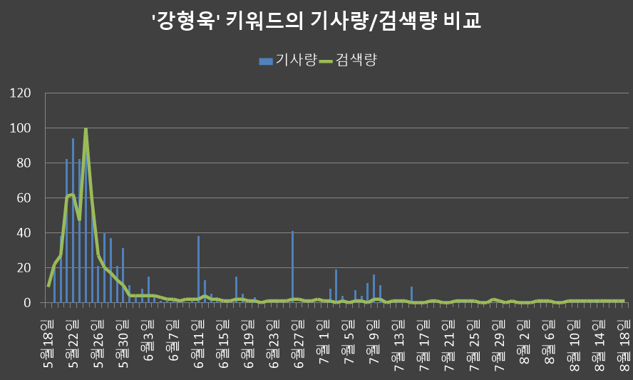 강형욱 훈련사 측의 해명이 발표된 이후, 언론은 이를 받아쓰며 보도를 이어갔다. 하지만 강 훈련사 측과 전 직원들 사이에 있었던 갈등이 어느 정도까지 사실이고, 그 사실이 어떤 공방을 통해 나타나고 있는지를 다룬 후속 보도는 찾아보기 어려웠다. 이 과정에서 강 훈련사에게 뜨겁게 빗발치던 관심은 급속도로 냉각됐다. 실제로 논란이 보도된 5월 말과 6월 초 사이 ‘강형욱’을 키워드로 한 기사량과 검색량은 폭발적이었지만, 시간이 흐를수록 현저히 줄어들었다. 진실을 확인하려는 움직임은 미비했고, 이 과정에서 ‘나락’에 가든 ‘극락’에 있든 당사자의 목소리와 상황은 여전히 소외됐다.