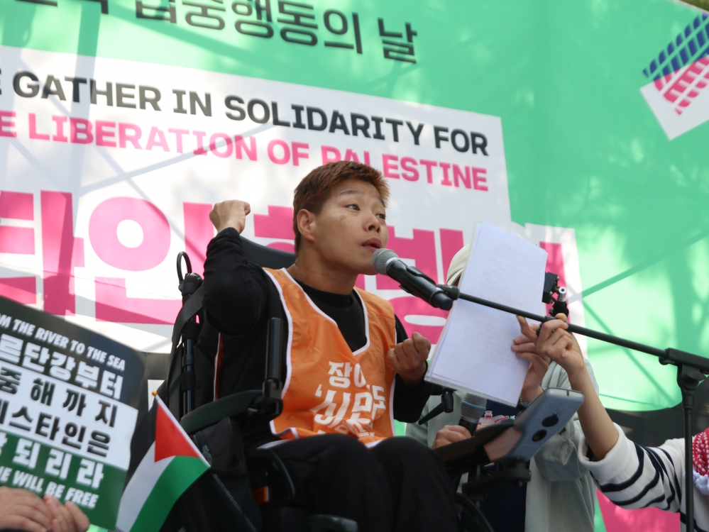 이날 집회는 모두의 투쟁이 연결돼 있음을 확인하는 자리이기도 했다. 퀴어팔레스타인연대 타리 활동가는 “저항하는 퀴어는 인간다움과 애도를 부정당하는 이들과 함께 싸우는 사람들”이라며 “해방의 연대자가 되기 위해서 도로 위에 함께 서고 행진해야 한다”고 목소리를 높였다. 장애여성공감 서지원 활동가는 “중증장애여성의 삶을 가두지 말 것을 요청하는 것은 생명을 통제하는 국가폭력에 저항하는 것이기도 하다”고 말했다. 장애여성과 팔레스타인 민중에게 가해지는 폭력의 배후에는 국가권력이 있다는 지적이다.