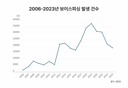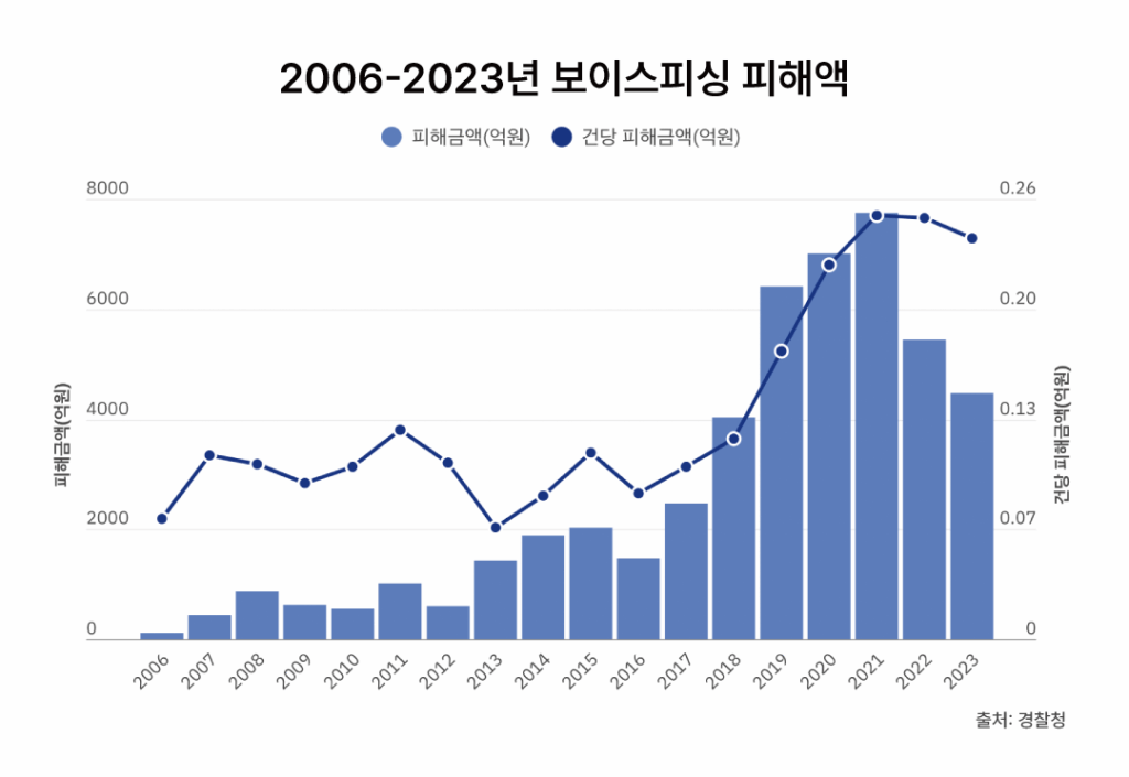 보이스피싱 범죄의 증감은 다소 변동을 보이지만, 장기적 관점에서는 지속적으로 증가하는 추세다. 피해 규모는 평균적으로 확대되고 있는데, 2020년대에 들어 1건당 피해 금액은 꾸준히 2천만 원대로 유지되는 것을 확인할 수 있다. 특히 메신저 피싱은 2020년부터 급격한 증가세를 보이고 있다. 경찰대 서준배 교수는 「한국의 사회동향-범죄·안전」(2022)에서 코로나19로 인해 보이스피싱 콜센터 일당들이 음성보다는 메신저로 이동한 것으로 추정했다. 콜센터 인원 다수가 한 공간에 모여 통화를 할 때 침으로 인한 코로나19 전파 위험을 무시할 수 없었기 때문이다.
