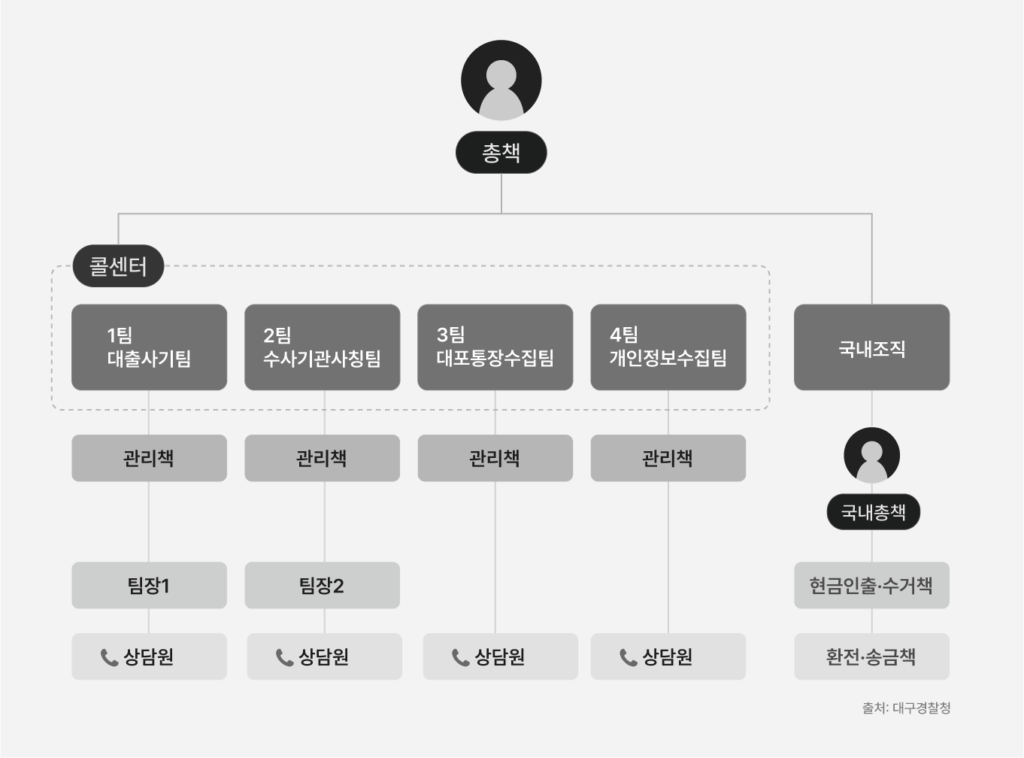 보이스피싱은 생각보다 더 집단적이고 체계적이다. 범행을 초기 단계부터 기획하고 범행 수법이나 수익 분배를 구체적으로 지시하는 주범인 총책하에 4개의 콜센터가 운영되며, 이들은 각각 ▲대출 사기팀 ▲수사기관 사칭팀 ▲대포통장 수집팀 ▲개인정보 수집팀으로 역할이 나뉜다. 보이스피싱 본부는 해외에 둔 채 국내 총책이 따로 존재하고, 현금 인출 및 수거책은 물론 환전 및 송금책까지 역할이 체계적으로 구분돼 있다. 각 팀의 상담원들은 관리책의 지시를 받아 무차별적인 전화 통화를 수행한다.