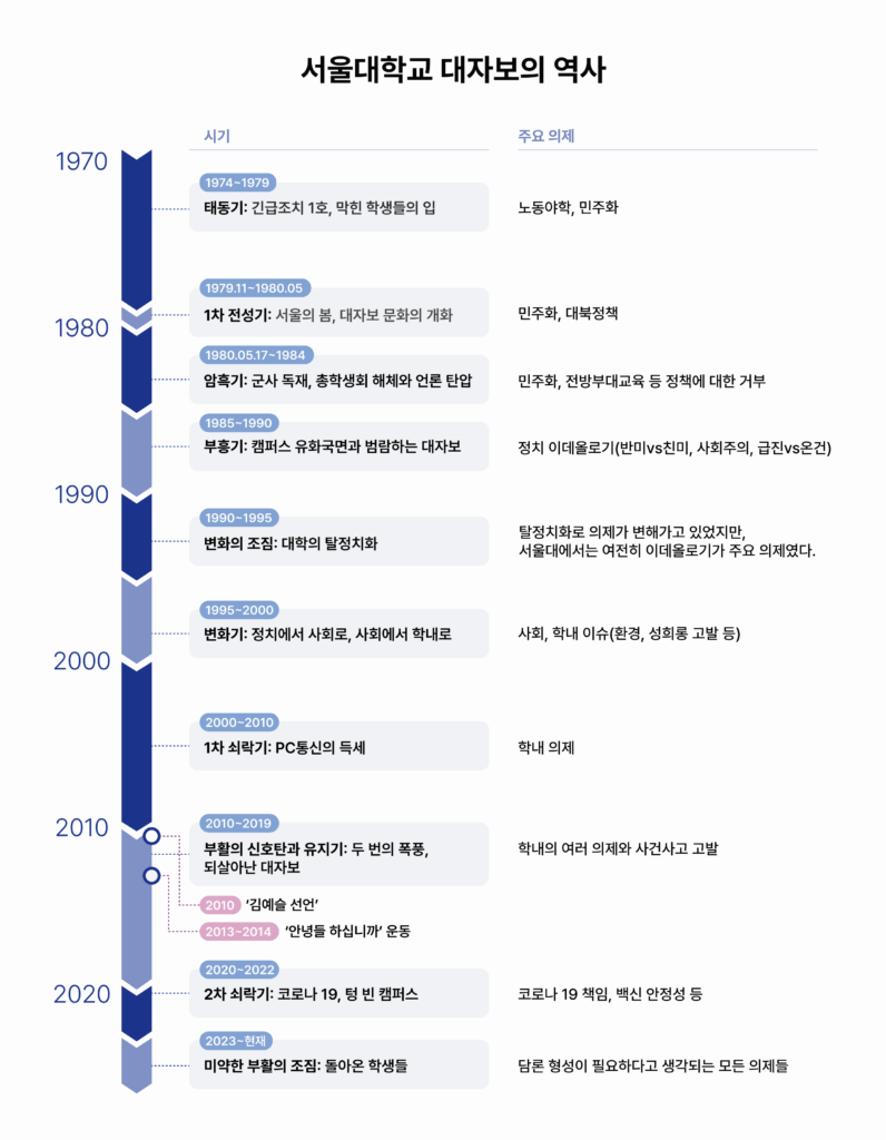 그러나 대자보의 전성기는 오래가지 못했다. 자유게시판이 세워지고 정확히 한 달 후, 1980년 5월 17일 전두환 전 대통령의 쿠데타와 함께 대학가의 입은 틀어막혔다. 정부는 서울대에 총학생회 해체를 요구하며 대학가에 경찰과 정보기관을 주둔시켰다. 쿠데타가 일어난 뒤 거센 탄압 속에서 살아남은 몇몇 대자보는 전두환 정권의 퇴진과 민주화를 외쳤고, 여기에 특별정훈교육*과 같은 정책에 대한 거부의 목소리도 더해졌다.