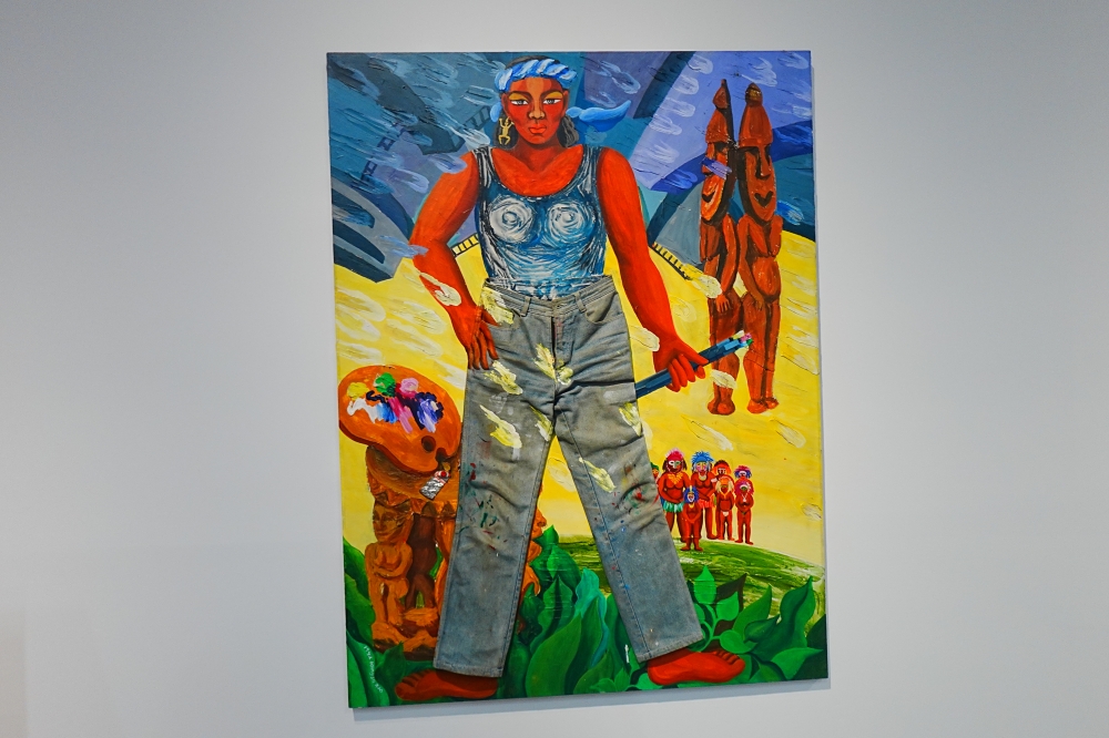 전시관 1층 입구를 지나다 보면, 강렬한 색채를 담아낸 선주민 여성과 마주하게 된다. 이 작품은 1960년대 한국 실험미술에 등장했던 아방가르드 작가 중 한 명인 정강자 작가의 「자화상」으로, 그가 중남미에서 남태평양까지 여행하며 체감한 이국적 풍경과 선주민의 생동감을 반영해 그린 자화상이다. 작품 속 작가는 머리에 끈을 동여매고, 화려하지만 토속적인 귀걸이를 착용한 채 한 손은 허리춤에 두고, 다른 손에는 붓을 들고 꼿꼿이 정면을 보고 있다. 근대 유럽 남성 작가는 고귀한 옷을 차려입고 붓과 팔레트를 든 모습을 그린 자화상을 통해 작업에 대한 자부심을 드러낸 반면, 정강자의 「자화상」 속 작가는 편안한 청바지를 입고 짙게 그을린 피부를 가진 모습으로 묘사된다. 작가는 서구 미술사에서 대상화되고 낭만화된 선주민에 대한 묘사를 지양하고 피식민지 아시아 여성으로 선주민과 자신을 동일시한다. 작가가 활동하던 1960년대에는 페미니즘이 정착되지 않았고, 여전히 남성 중심적이고 서구 중심적인 사고가 예술계 지배적이었다. 이러한 환경 속에서 선주민과 유사한 피부색을 가진 채 당당히 붓을 든 모습을 반영한 그녀의 작품은 비서구권의 대상화와 백인 남성 중심의 예술관에 저항함으로써 여성 작가로서의 정체성을 드러낸다.