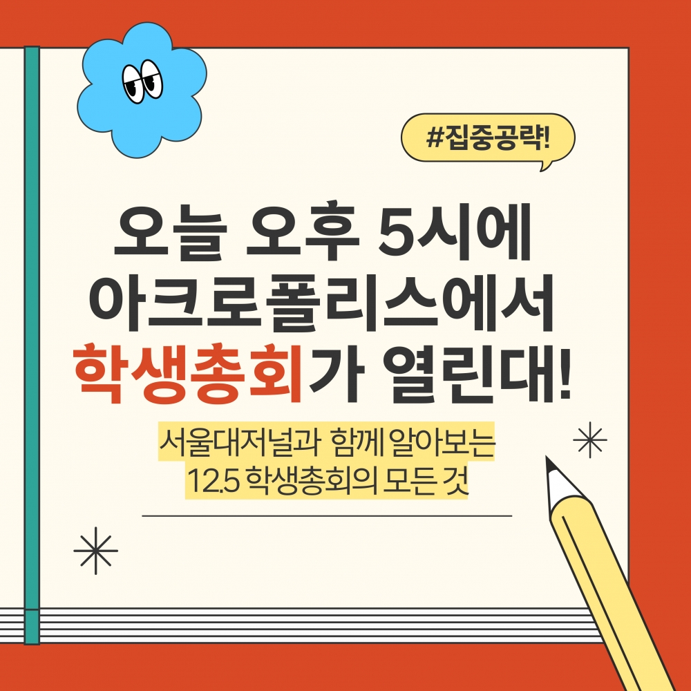 학생총회는 모두가 한 표를 던져 학생사회의 의견을 모으는 직접 민주주의의 장이다. 윤석열이 멈춘 민주주의의 시간을 우리는 다시 민주주의로서 이어갈 것이다. 오늘 오후 5시, 아크로폴리스에 울려 퍼질 함성을 기다린다.