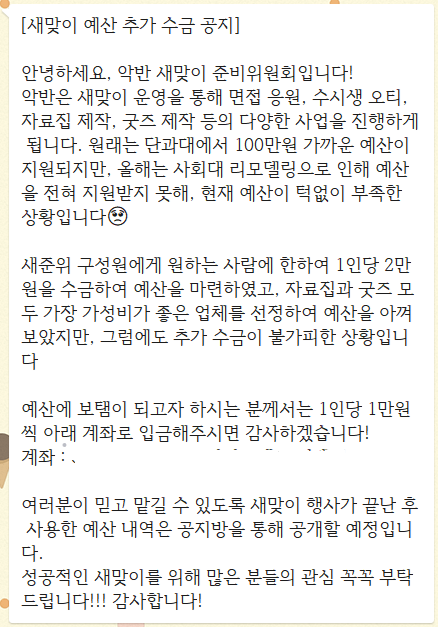 시설 공사로 단과대학의 예산이 소모되면서, 학생활동 지원 비용이 감축되기도 했다. 단과대는 각 학과·학부의 신입생 맞이 행사(새맞이)에 매년 약 100만 원의 예산을 지원해 왔으나, 올해는 사회대 리모델링으로 인해 지원이 전혀 이뤄지지 않았다. 이에 과·반 학생회는 자료집 제작 및 인쇄, 오리엔테이션 준비 등에 드는 새맞이 비용을 자체적으로 마련해야 했다. 사회학과 새맞이준비위원회는 굿즈 판매를 통해 새맞이 비용을 충당하고자 했으나, 비용이 충분히 모이지 않아 구성원들의 후원을 받기도 했다.
