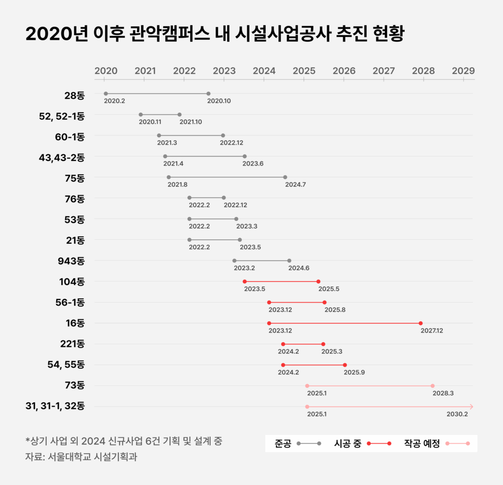 서울대 캠퍼스의 빈번한 공사는 본부 차원에서 계획 및 관리된다. 서울대는 『서울대학교 캠퍼스 마스터플랜 2012-2016』을 시작으로 5년마다 중장기 캠퍼스 관리 방향을 제시하는 5개년 종합계획을 발표하고 있다. 2021년에 수립돼 현재 이행 중인 『서울대학교 캠퍼스 마스터플랜 2022-2026』은 ‘액티브 캠퍼스’를 주제로 통일성 있고 효율적인 캠퍼스를 위해 본부·학내시설사업 기획을 총괄하는 ‘캠퍼스건축가’ 제도 신설 및 신축·리모델링 가이드라인 마련 등을 제안했다. 해당 마스터플랜에 따라 2022년 7월에는 캠퍼스 내 공간 사업 통합 공모를 위한 사이트인 ‘서울대학교 디자인캠퍼스’가 개설됐다. 이를 통해 물리천문학부(56동) 증축과 음대 예술관(54, 55동) 리모델링 등 이미 시공 중인 사업은 물론, 인문대(5,6,7동) 증축, 수의대 동물병원(80동) 증개축, 중앙도서관(82동) 본관 4층 공간 리모델링 등 아직 시공하지 않은 사업 공모도 진행됐다.