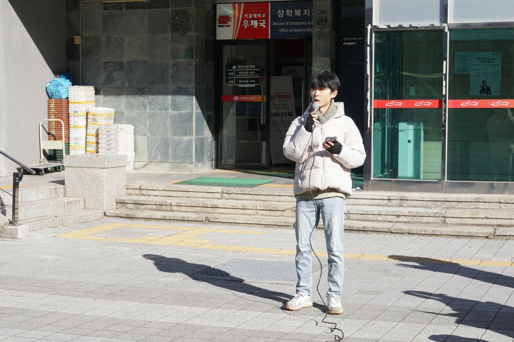 광장의 경계를 넘어 일상 전반을 돌아보고 숙고해야 한다는 외침도 있었다. 이재현(서양사 18) 씨는 계엄 이전에도 “언제나 계엄에 준하는 상황 속에서 살아온 이들은 민주주의에서 보이지 않게 숨기면 그만인 것으로 치부된다”고 말했다. 이어 “다양한 목소리와 깃발, 요구들을 가로지르며 대안을 만들고 엮어나가는 일을 포기하지 않아야겠다고 다짐했다”며 “집보다는 광장에 있어야 한다고 말하기보다는, 집과 광장의 구획을 넘고 부수는 일을 멈추지 말아야 한다”고 강조했다. 이병호(지리 23) 씨는 정치의 본질이 곡해되고 있는 학생사회의 현실을 지적했다. 이 씨는 “정치는 우리의 문제를 우리가 스스로 해결하는 것이지만 학교는 이를 불순한 것으로 비난하고 있다”고 말했다. 이어 “우리의 문제임에도 늘 외부에 해결을 맡겨왔기에 내란 사태가 촉발됐다”며 “사유와 실천을 외면하지 말고 주변의 문제를 해결하는 과정에 동참해야 한다”고 말했다.