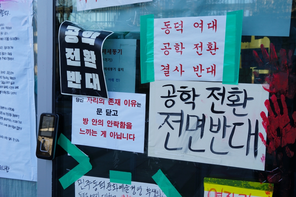 지난 19일 동덕여대 총학생회와 학교 측은 제5차 처장단 면담을 진행해 교수, 동문, 학생, 직원이 구성원으로 참여한 공학 전환 공론화위원회 추진을 결정했다. 결성 과정부터 세부 논의 과정을 모든 구성원에게 공개하고, 2025년 3월부터 6개월간 의견 수렴을 통해 충분한 공론화 시간을 갖겠다는 것이다. 그러나 학교는 면담 성사 조건으로 면담 당일 학생 시위를 진행하지 않기를 요구했다. 또한 23일에는 포털을 통해 ‘규정을 위반한 집회와 홍보물로 학교의 정상적 운영이 방해받고 있다’며, ‘불법 집회와 불법 게시물에 대해 학칙 등 관련 규정에 따라 엄격하게 조치할 예정’이라고 밝혔다. 함께 올라온 ‘본관 앞 도로에 무단 방치된 과잠 수거 요청’에서는 ‘현재 본관 앞 도로에 과잠이 무단 방치돼 차량 통행이 불가한 상황’이라며 ‘소방기본법 제16조의3(생활안전활동) 제1항 제5호와 교통안전법 제4조, 제8조에 의거 25일까지 과잠을 수거하지 않으면 본부에서 방치된 과잠을 이동시키겠다’고 알렸다.