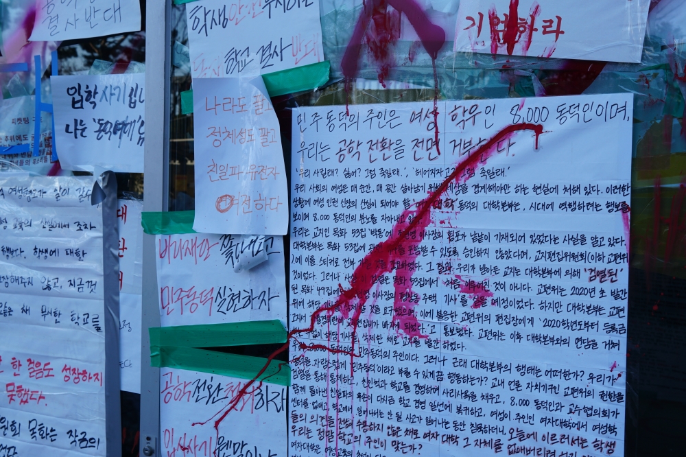 학생들의 목소리를 지우려는 시도에는 법률을 지속적으로 인용하여 협박하면서 학생을 억압하기 위해서 위법행위를 일삼고 있는 학측의 행보에 분노가 차오른다. 법적으로 문제가 되지 않는 부분까지 문제삼으려 하고, 나아가 헌법에 명시된 기본권 중 하나인 ‘집회 및 결사의 자유’를 침해하려는 대학본부의 모습을 보며 우리 재학생과 졸업생들은 경악을 금치 않을 수 없다. 대한민국 어느 곳에서도, 집회의 자유는 헌법에 명시된 국민의 권리이며 우리는 민주동덕의 이름을 지키기 위해 끝까지 목소리를 내서 학내 민주주의를 위해 투쟁할 것이다.