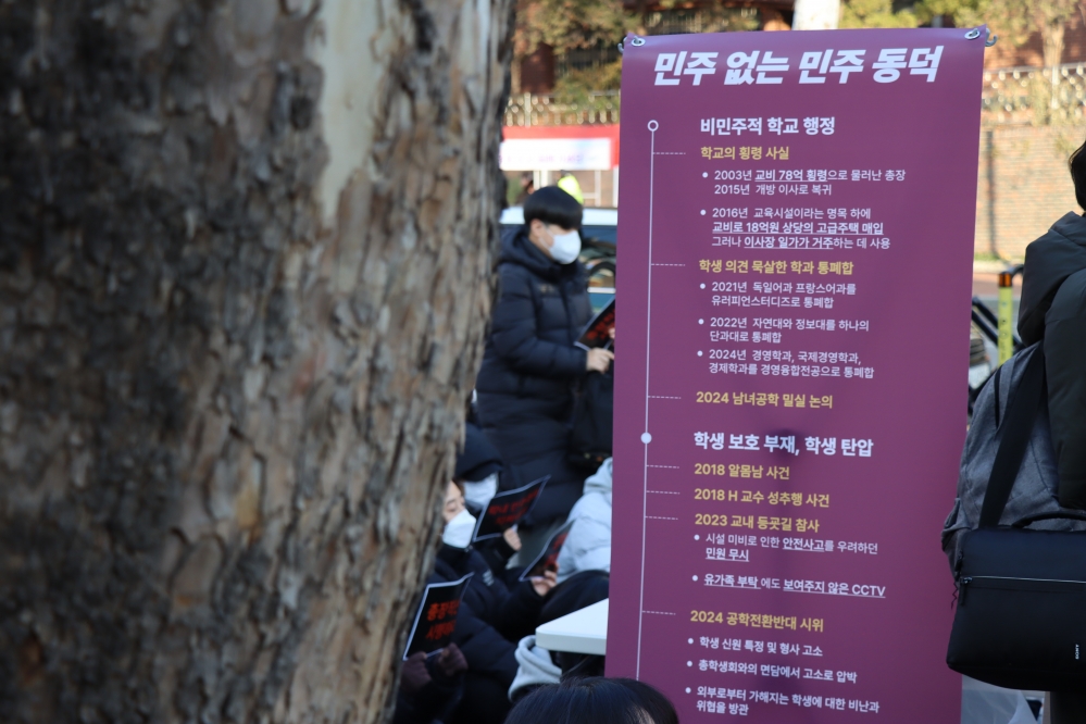 학생들은 지난 몇 년간 학교 측의 무책임한 태도와 불투명한 소통이 지속됐다고 지적했다. 학교는 2018년 ‘알몸남’ 사건과 H교수의 성추행 등에 관해 학생을 적극적으로 보호하지 않는 미온적 대응으로 일관했고, 2021년부터는 학생들의 반대 의견을 묵살한 학과 통폐합과 학부제 개편을 추진했다. 2023년에는 6년 이상 안전시설 미비가 지적돼 왔던 등굣길 언덕에서 한 학생이 사망한 사건이 발생했다. 사고 이후 학측은 유가족에게 CCTV 자료를 제공하지 않고, 총장 사퇴와 공식 사과 등 학생의 요구를 무시했다.