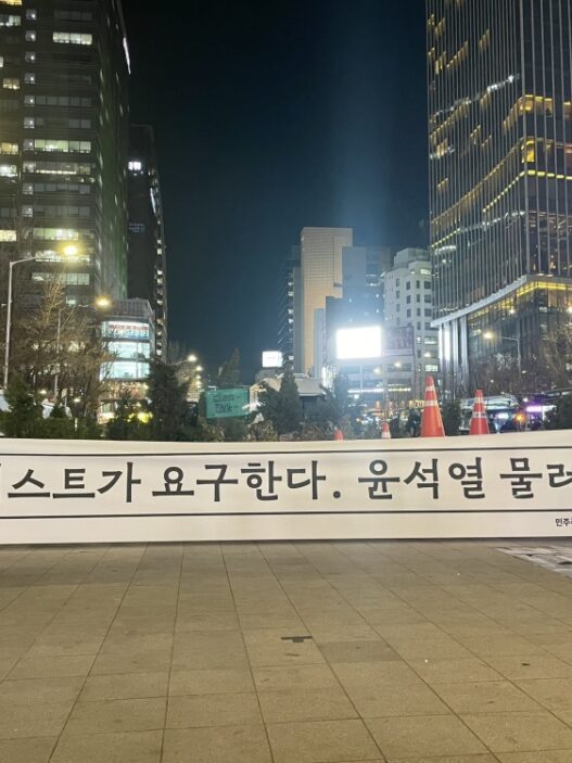12·3 내란 사태 이후 더 많은 사람들이 민주주의 수호를 절실히 외치게 된 정국은 동덕여대 학생들의 목소리와도 공명했다. 동덕여대의 투쟁이 시민사회 전반의 문제로 확장될 수 있으며, 민주사회를 위한 움직임은 동덕여대 학생들과의 연대로 이어져야 한다는 공감대가 형성된 것이다. 연대발언을 진행한 서강대 인권실천모임 ‘노고지리’ 소속 C씨는 “국민을 탄압의 대상으로 보는 윤석열과 학생을 탄압의 대상으로 보는 동덕여대 학측은 다르지 않다”고 꼬집으며 “학측이 구성원의 목소리를 들어야 한다는 메시지는 여성을 넘어 시민사회의 모든 구성원에게로 확장될 것”이라 주장했다. 이듬해 대학 입학을 앞두고 있는 D씨는 “정부와 학교 당국 모두에게 민주주의가 무엇인지 알려주는 것은 오늘 이 자리에 모인 학생들”이라 말했다.