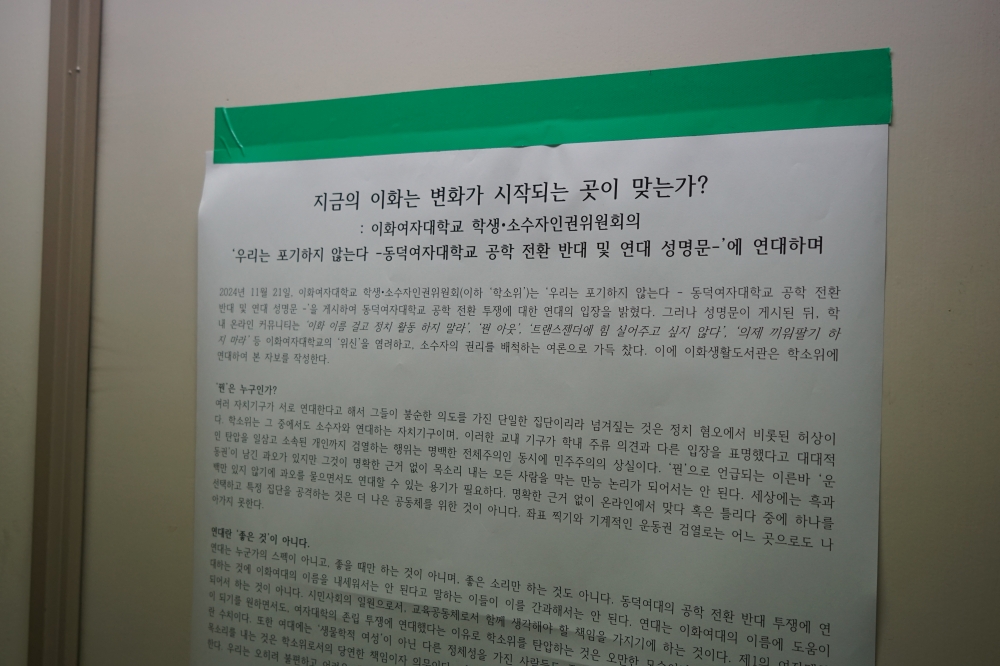 한편, 동덕여대의 공학 전환 반대 투쟁에 광주여대와 성신여대를 비롯한 여러 여대가 연대했다. 이화여대는 총학 차원의 입장 표명은 없었으나 11월 21일 학소위의 연대 성명문 발표가 있었다. 학소위는 동덕여대 학생들의 움직임을 단순한 폭력 사태가 아닌 “폐쇄적인 학교 본부에 대한 저항”이자 “진작 이루어졌어야 마땅한 의사소통을 요청하고 있는 것”이라 봤다. 학소위는 “가부장적 사회에서 배제되는 형태의 몸을 가진 사람들에게 기회를 주기 위함”인 여대의 설립 목표와 그로부터 쌓여온 여대 공동체 내의 사회적 합의를 강조하며, 여대 소멸에 대한 혐오를 중단할 것을 촉구했다. 그러나 이후 성명문과 학소위에 대한 온라인상의 공격이 이어졌고, 학소위는 23일 추가 성명문을 통해 학소위가 이화여대 전체 학생의 의견을 대변하진 않는다는 사실을 해명해야 했다. 이화생도는 이날 학소위의 성명문과 동덕여대 공학 전환 반대 투쟁에 연대하는 성명문을 발표해 학소위에 대한 비난의 목소리가 “좌표 찍기와 기계적인 운동권 검열”에 그쳐 현 사태를 납작하게 바라보는 건 아닐지 우려했다.
