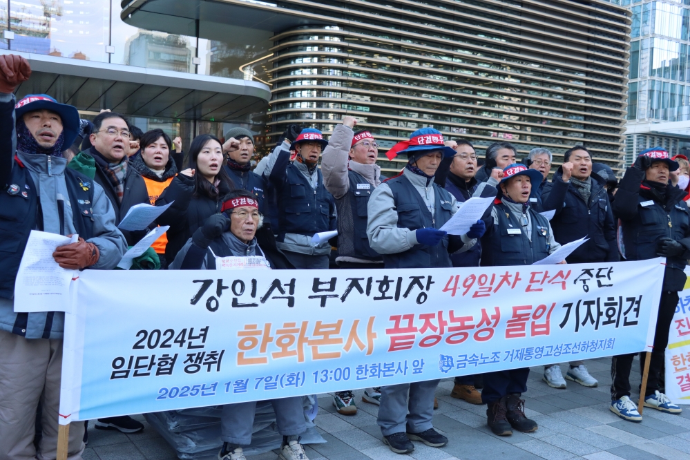 한화오션(옛 대우조선해양)의 단체교섭 타결을 촉구하는 하청노동자의 단식 투쟁이 49일째인 지난 7일 중단됐다. 금속노조 거제통영고성조선하청지회(조선하청지회)는 이날 오후 1시 서울 한화그룹 본사 앞에서 기자회견을 열어 강인석 부지회장의 단식 중단을 알리고, 본사 건물 앞에서 농성에 돌입한다고 밝혔다.