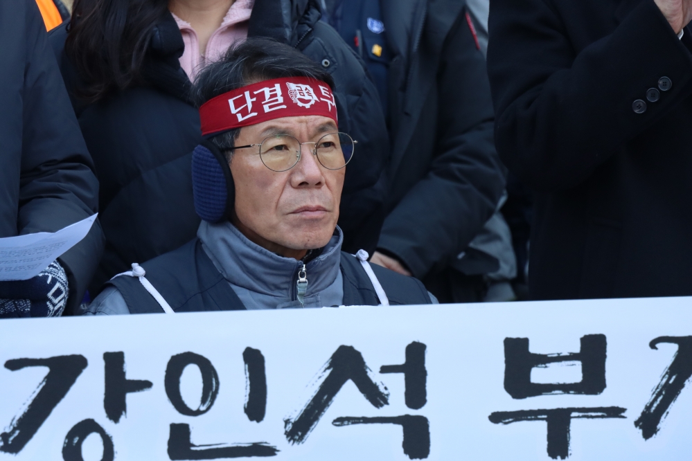 49일간 단식한 강인석 부지회장도 마이크를 잡았다. 강 부지회장은 중대재해로 희생된 한화오션 하청노동자들을 거론하며 “그분들을 생각하면 단식 49일은 아무것도 아니”라고 거듭 말했다. 한화오션에서는 지난해 1월 12일 폭발 사고로 노동자 한 명이 사망한 데 이어 같은 달 24일 잠수 작업을 하던 하청노동자가 숨지는 사건이 발생했다. 지난해 8월에는 하청노동자 2명이 온열질환으로 목숨을 잃었다.