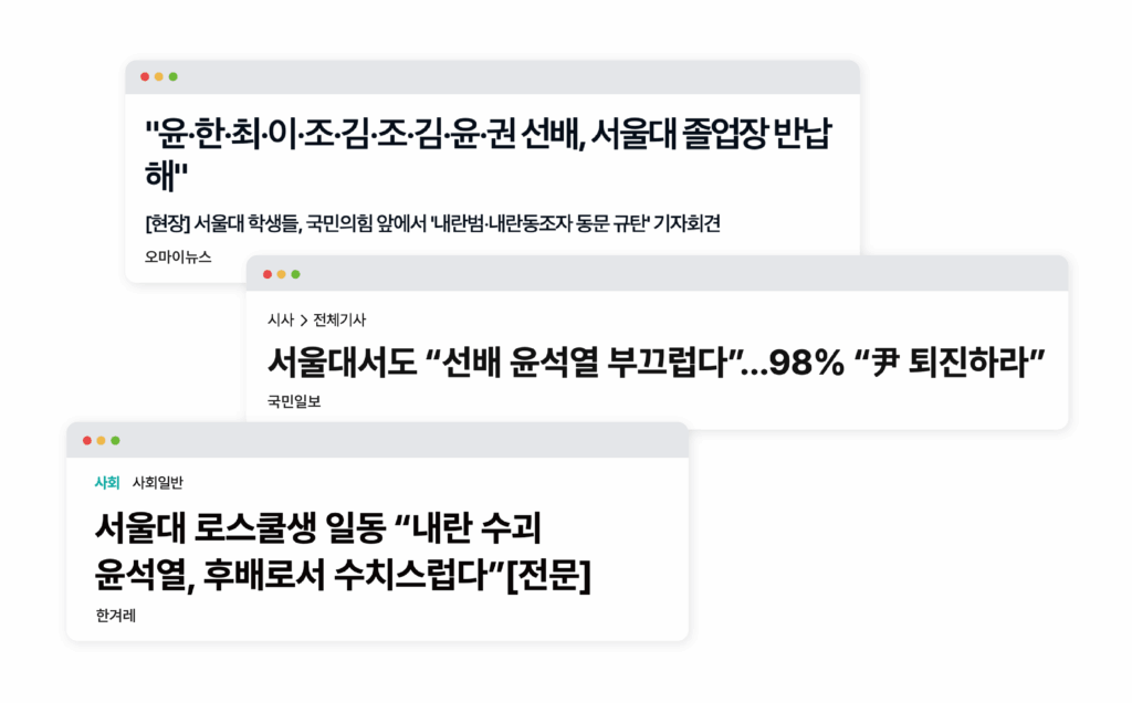이 계엄 전에도 서울대가 윤석열 대통령을 배출한 대학이라며 많은 논란이 있었다. 내가 생각하기엔, 그때 목소리를 내지 않은 것에 대한 질책이 아닐까. 더 이상 부정할 수 없을 정도로 큰 잘못이 터지니까 이제서야 말한다는 의미로.