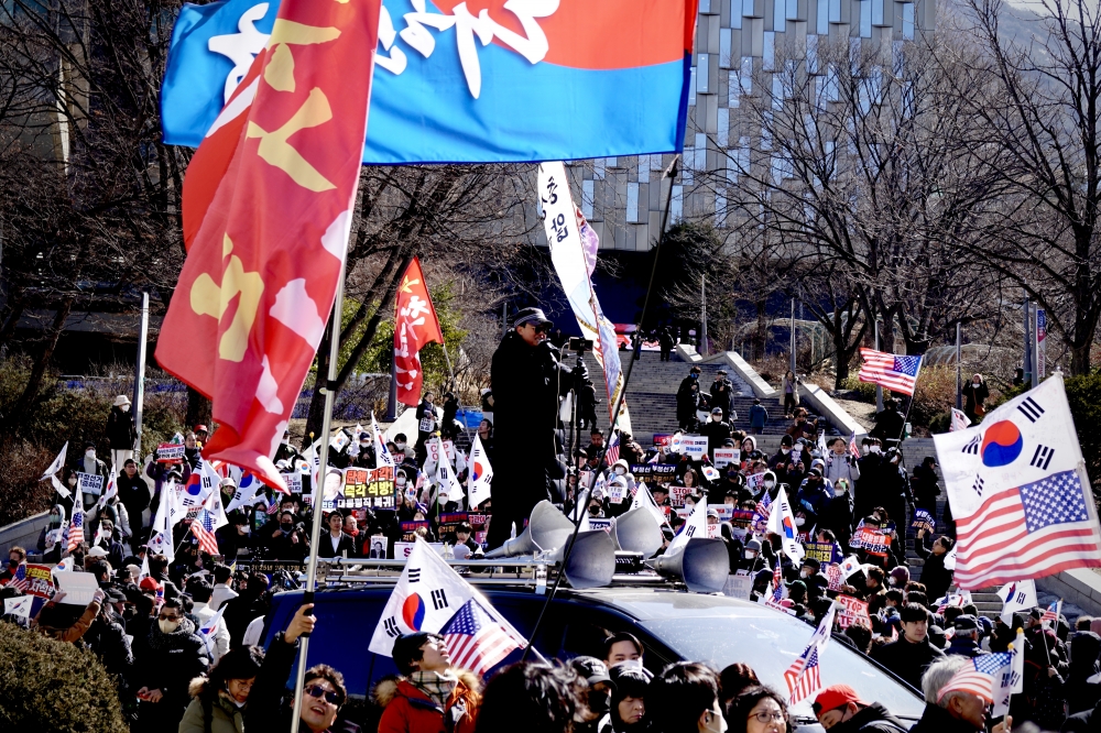 지난 2월 17일 서울대 재학생·졸업생 300여 명이 윤석열 탄핵 반대 시국선언을 발표했다. 자신을 ‘자유민주주의를 수호하는 서울대인’이라 밝힌 이들은 “비상계엄 선포는 자유 대한민국을 수호하기 위한 정당한 조치”라고 주장했다. 국회와 시민에게 총구를 겨눈 12.3 비상계엄이 반국가 세력을 척결하기 위한 ‘계몽령’이라는 주장이다. 여기서 말하는 ‘반국가 세력’에는 야당과 국회뿐만 아니라 공수처, 사법부, 헌법재판소 등 이른바 ‘사법 카르텔’도 포함됐다. 극우 세력이 퍼뜨린 대안적 사실을 받아들인 이들은 중국과 북한의 지령을 받은 반국가 세력이 부정선거를 일으켰다고 주장했다. “지금 6.25보다 심각한 하이브리드 전쟁*이 벌어지고 있다”고 말하는 발언자에게 태극기와 성조기를 든 군중이 열렬한 환호를 보냈다.