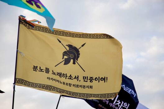 하길 원문대로 ‘분노를 노래하소서, 여신이시여’를 쓸 생각이었는데, 깃발을 디자인한 지인이 여신 대신 민중을 넣으면 어떻겠냐고 제안했다. 마침 내가 좋아하는 또 다른 작품인 『레미제라블』에서도 민중이 핵심어다. 뮤지컬 넘버 ‘민중의 노래’도 있고. 『일리아스』와 『레미제라블』, 두 작품을 하나로 녹여낸 문구다. 또 민중으로서 광장에 나서는 것이니 나름의 의미가 있겠다고 생각했다. 큰 뜻 없이 만든 문구에 의미가 쌓이고 쌓였다.