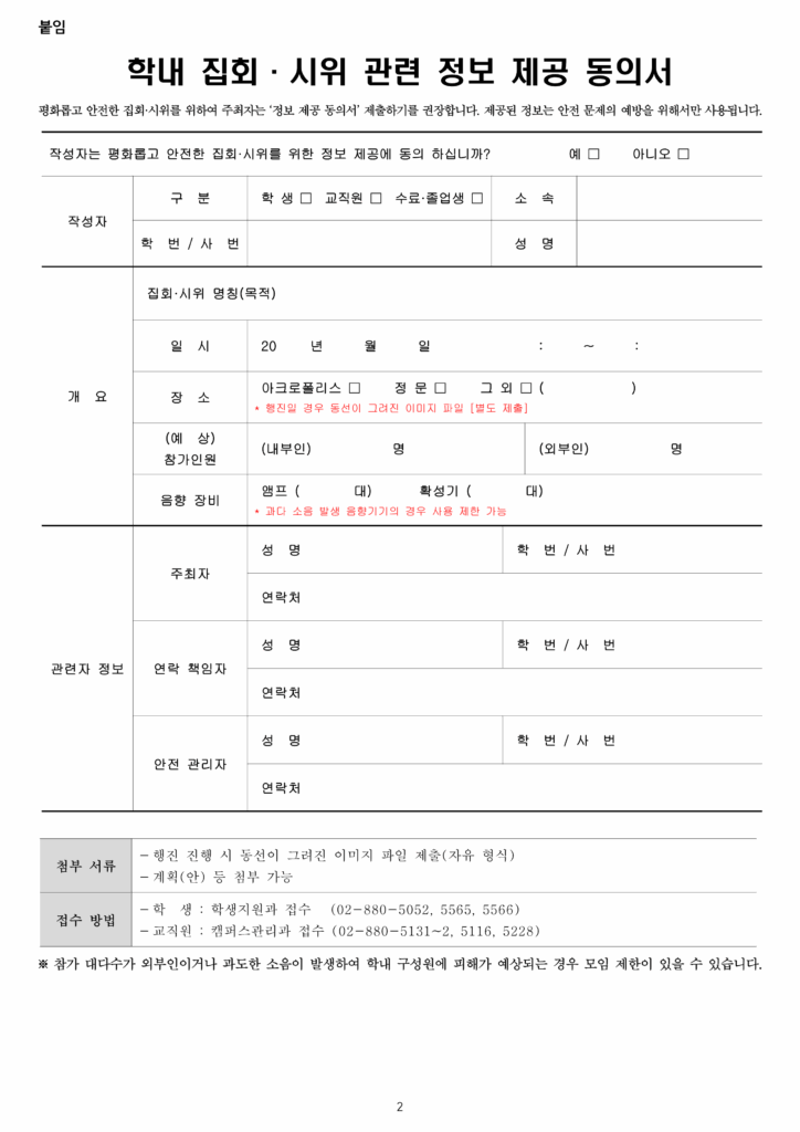 한편 총학생회는 “집회·시위 진행 안내서와 정보 제공 동의서가 집회·시위의 자유를 제한하는 장치로 작용할 가능성을 우려해, 학생들의 피해를 최소화할 수 있는 방향으로 완성”했다며 학내 집회로 인한 학생 피해를 최소화할 수 있도록 본부와 소통을 이어가겠다고 밝혔다.