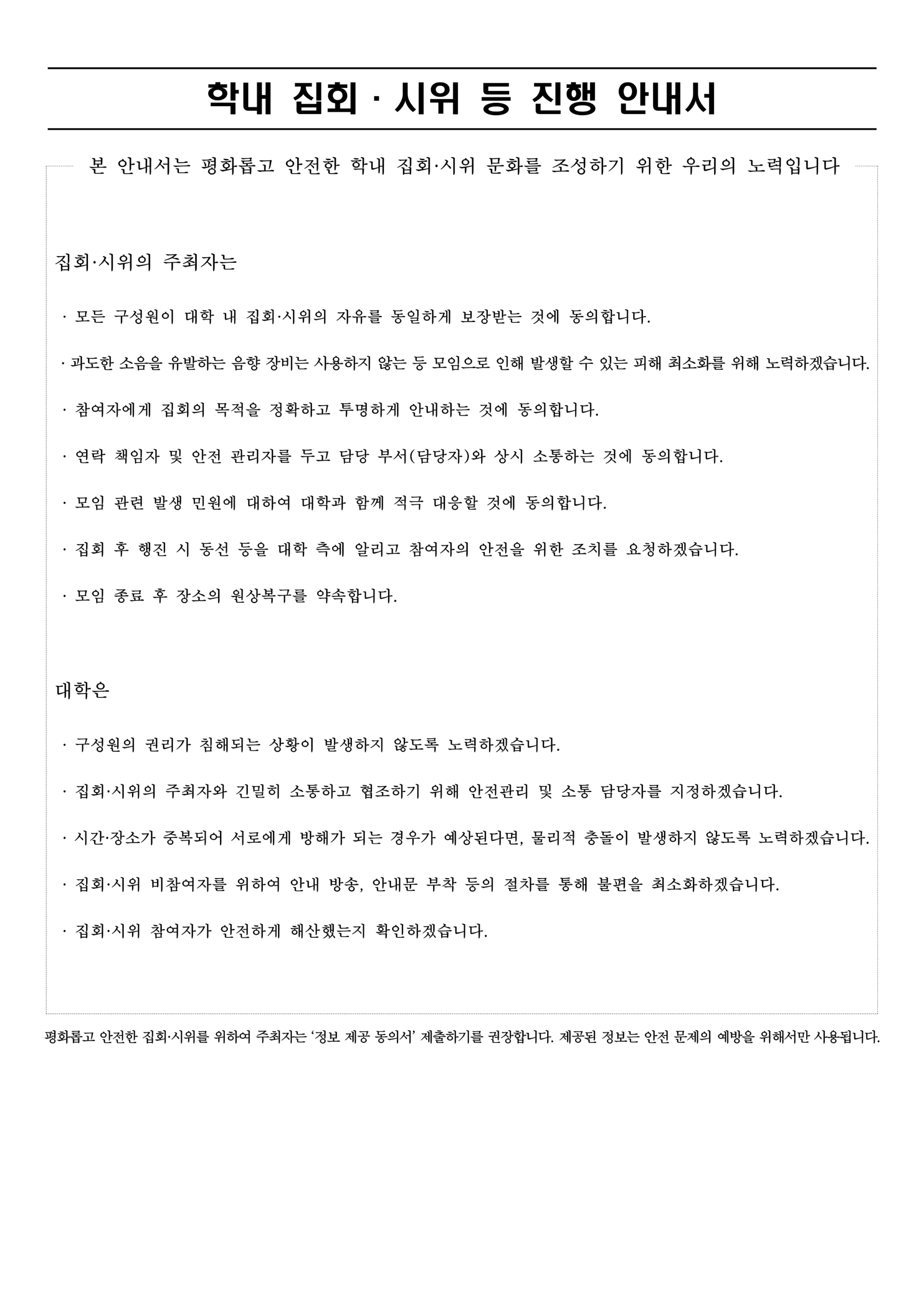 한편 총학생회는 “집회·시위 진행 안내서와 정보 제공 동의서가 집회·시위의 자유를 제한하는 장치로 작용할 가능성을 우려해, 학생들의 피해를 최소화할 수 있는 방향으로 완성”했다며 학내 집회로 인한 학생 피해를 최소화할 수 있도록 본부와 소통을 이어가겠다고 밝혔다.