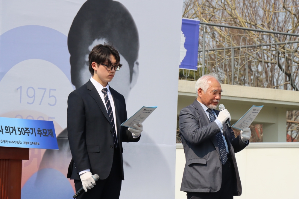추모제는 추모문집 『오랫동안, 김상진』 헌정으로 시작됐다. 기념사업회가 50주기를 맞아 발간한 추모문집은 그의 생애와 관련 자료, 의거를 기리는 다양한 목소리를 담았다. 김상진열사의거 50주년기념사업 추진위원회 안병권 위원장(농생물 79)은 “故 김상진 열사의 뜻과 지향이 후세들에게 이어지길 바란다”는 헌정사를 전했다.