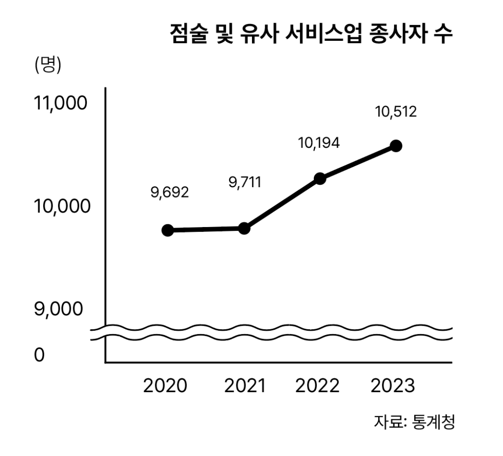 점술 시장의 규모를 엿볼 수 있는 공식적인 통계는 매년 통계청에서 진행하는 사업체 조사뿐이다. 2023년의 ‘점술 및 유사 서비스업’ 종사자 수는 1만 512명으로, 해마다 꾸준히 증가하고 있다. 그러나 업계 종사자 대부분이 사업자등록을 하지 않았다는 점에서 통계가 빙산의 일각이라는 평가도 있다. 스타트업 분석 업체 ‘혁신의숲’에서는 점술 시장 전체의 규모를 약 1조 4천억 원으로 추정했으며, 국내 최대 규모 무속단체인 대한경신연합회는 2024년 기준 무당 약 30만 명이 활동 중이라고 발표했다. 이런저런 추산은 많지만, 정확한 규모 파악은 불가능하다.