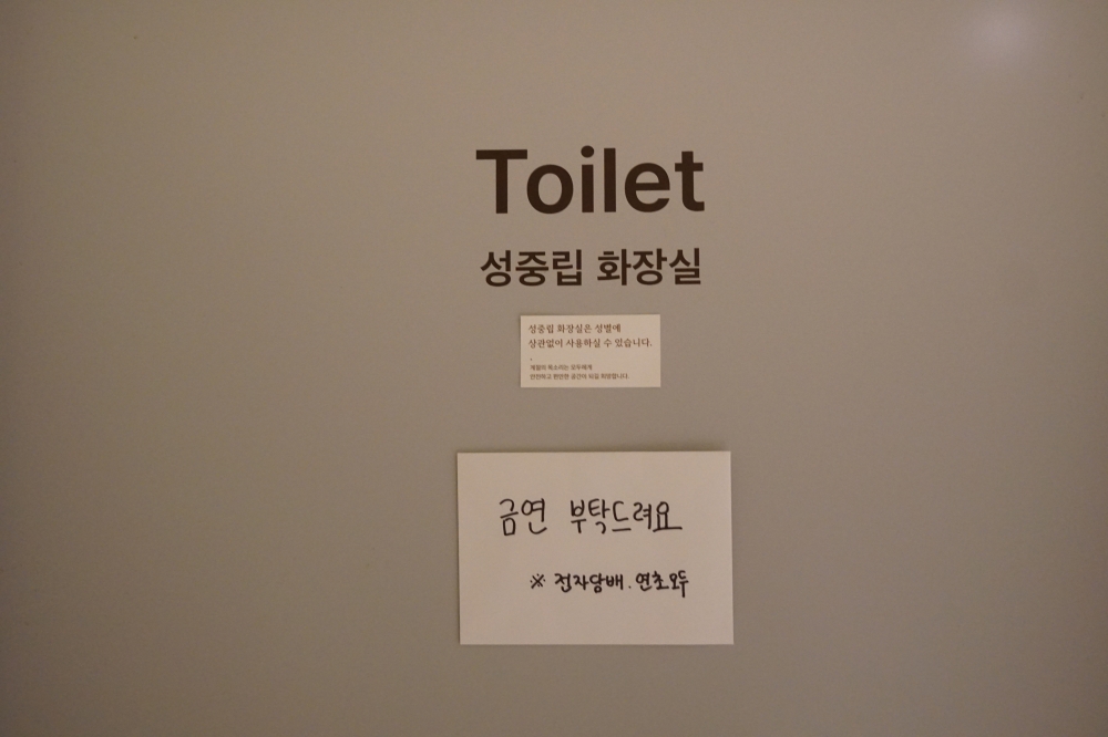 계절의 목소리 성중립 화장실은 성중립 화장실은 공간과 고객에게 자연스럽게 스며들어 자리 잡고 있다. 운영진은 환한 얼굴로 성중립 화장실 사진을 찍어가는 고객과 긍정적인 블로그 후기들을 생각하며 늘 안전한 공간 기획을 위해 애쓴다고 전했다.