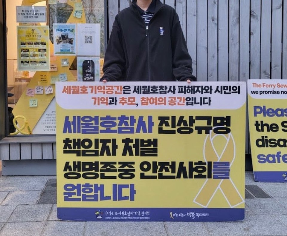 3월 27일, 피케팅(피켓 시위)을 신청한 후 향한 기억공간은 환히 불을 밝힌 현판 덕에 멀리서도 어렵지 않게 알아볼 수 있었다. 구석에 놓인 테이블엔 누군가 만들다 만 듯한 리본과 열쇠고리가 쌓여 있었고, 그 옆엔 세월호 선체 모형과 각양각색 리본이 놓여 있었다. 아리셀 중대재해 참사의 하늘색 리본, 가습기 살균제 참사와 오송 지하차도 참사의 녹색 리본, 스텔라데이지호 참사의 주황 리본, 이태원 참사의 보라 리본, 그리고 세월호 참사의 노란 리본. 또 한 번의 참사가 발생할 때마다 누군가는 이곳에 새로운 리본을 채워 넣었을 것이다.
