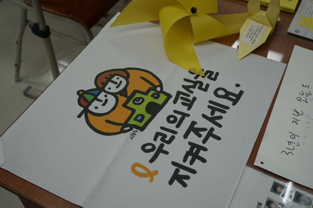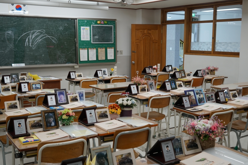 입구에서 방명록을 작성하고 유의사항을 들은 후 3층으로 올라가면 노란 조끼를 입은 해설요원을 만날 수 있다. 참사 유가족이기도 한 해설요원의 안내에 따라 복도와 교실을 차례로 둘러봤다. 교실 문을 열자마자 펼쳐진 장면에 잠시 숨을 멈췄다. 너무 많은 빈 책상. 희생자들의 사진과 꽃이 올라간 책상들. 공간을 채운 상실의 크기는 희생자 수 이상의 것이었다. 4월 14일 이후 빗금이 그어지지 않은 식단표, 필기구가 가지런히 든 캐릭터 필통, 빛바랜 시간표와 유인물들. 교실 앞 게시판엔 방과후학교, 알림 자료, 오늘의 식단을 알리는 게시글이 붙어있었다. 그 공간에 기억이 있었다. 희생자라는 말에 전부 담길 수 없는 뜨겁고 생생한 삶들이 그곳에 있었다. 종이학과 종이배, 칠판을 가득 메운 글과 영원히 시들지 않을 뜨개꽃. 그날 이후 작은 화이트보드에 꾹꾹 눌러 썼을 말, 과제: 꼭 돌아오기. 보고 싶다는 말을 아무리 적어도 부족한 칠판이 있듯이, 기억하겠다는 말을 아무리 반복해도 모자랄 세월이 있다.