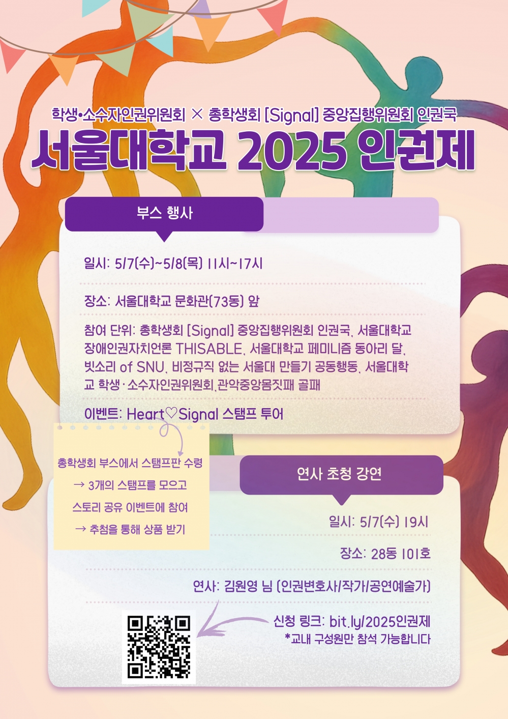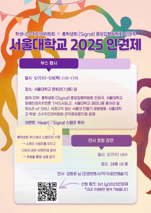 5월 7일부터 8일까지 양일간 ‘학생·소수자인권위원회(학소위)’와 총학생회 ‘Signal(시그널)’ 인권국이 공동 주최한 학내 인권제가 열린다. 학소위는 2023년부터 매 학기 정기적으로 인권제·인권주간 운영을 주관하고 있다. 이번 인권제는 시그널 인권국과 기획과 진행을 함께했다.