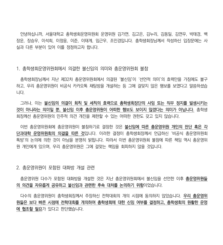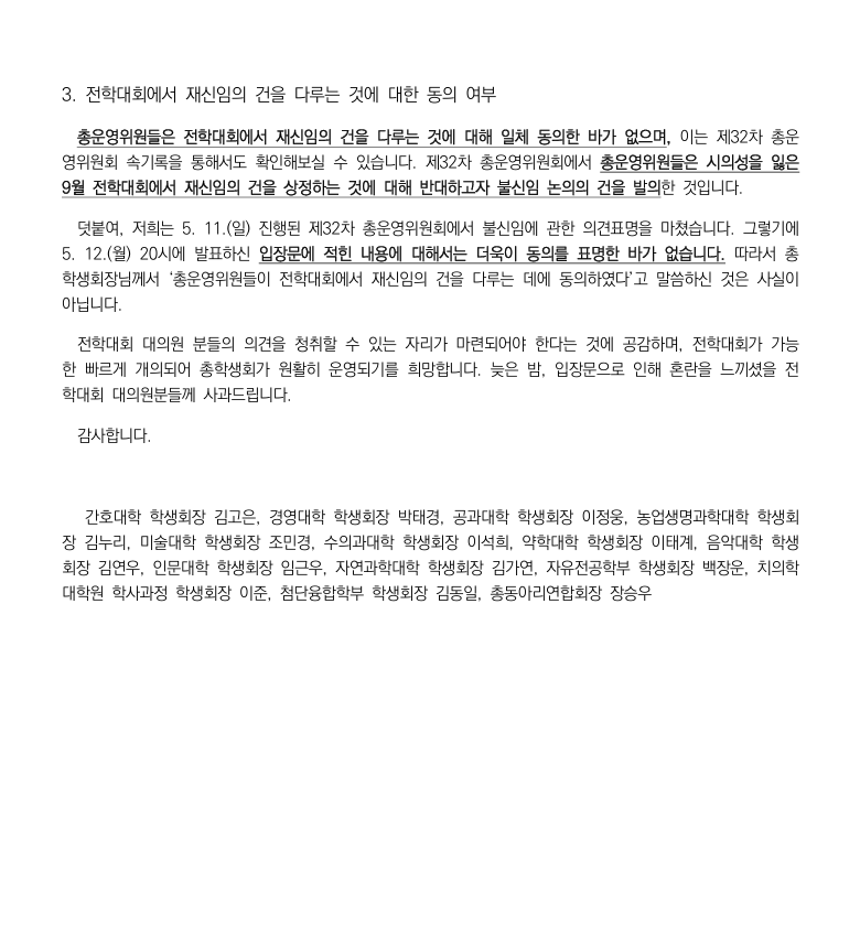 김민규 총학생회장은 ‘전학대회에서 재신임의 건을 다루는 데 총운위원들이 동의했다’고 주장하며, 전학대회가 열릴 때까지는 각자의 의무를 다해야 한다고 총운위원들을 질타했다. 이에 총운위원들은 해당 주장은 사실이 아니라고 반박했다.