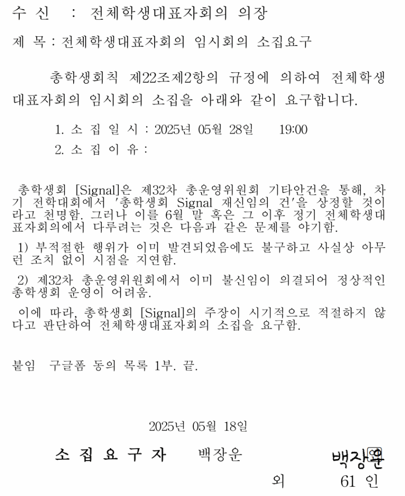 앞서 시그널은 지영석 중앙집행위원장(건설환경공학 22)의 ‘에브리타임’ 여론 조작 시도가 알려지며 비판받았다. ▲윤석열 퇴진 총궐기 불참 선언 및 거짓 해명 ▲지역 혐오 ▲윤석열 퇴진 반대발언 지명 등으로 지탄받은 데 이어 또다시 학생사회의 신뢰를 저버린 것이 불신임의 발단이 됐다. 5월 28일 열릴 임시 전학대회에서는 탄핵안, 사퇴요구안 등 총학생회장단의 거취에 관한 안건이 다뤄질 전망이다.