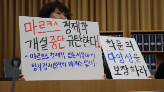 “마르크스 경제학 개설 중단 규탄한다” 정치경제철학 특별포럼에서 학생들 피켓 시위